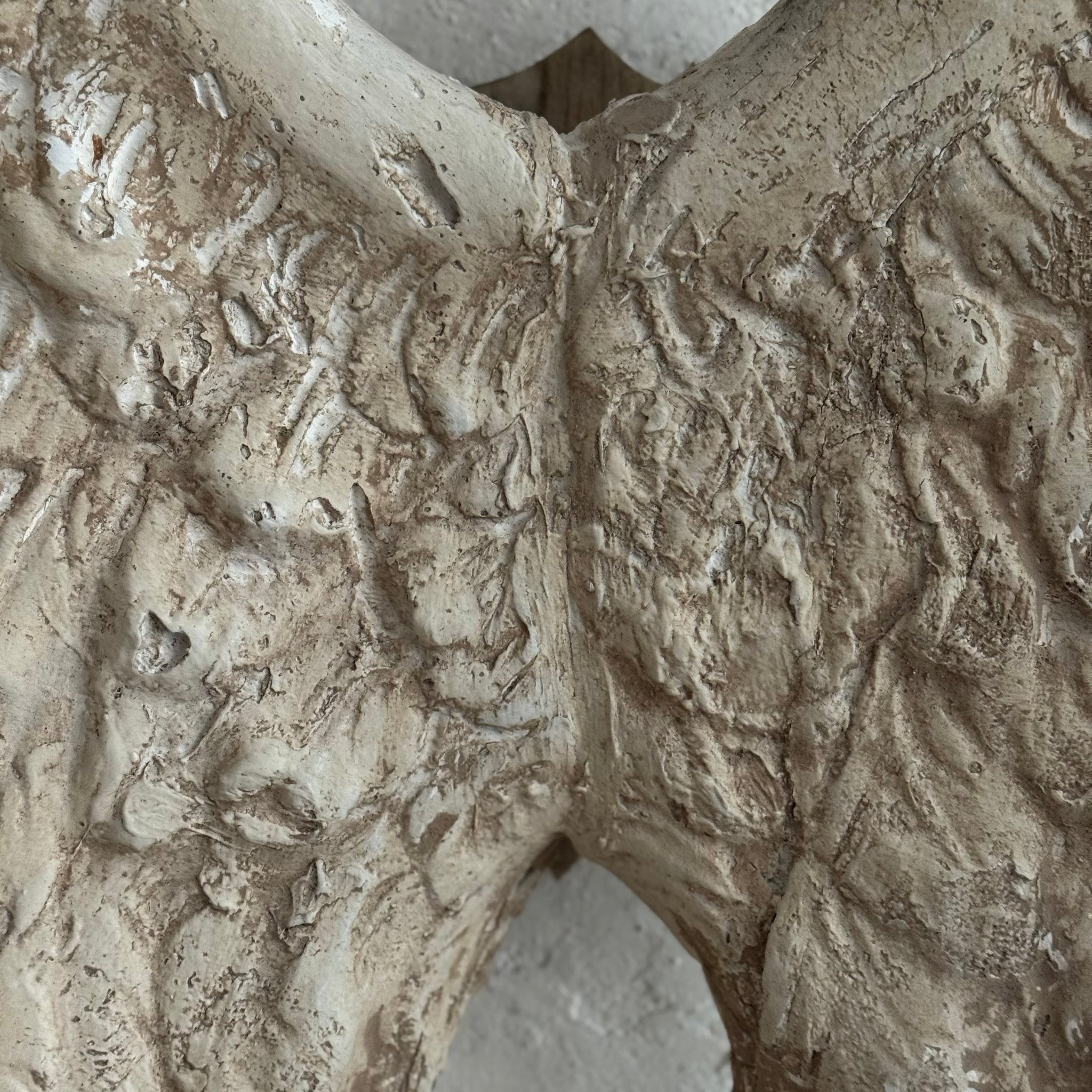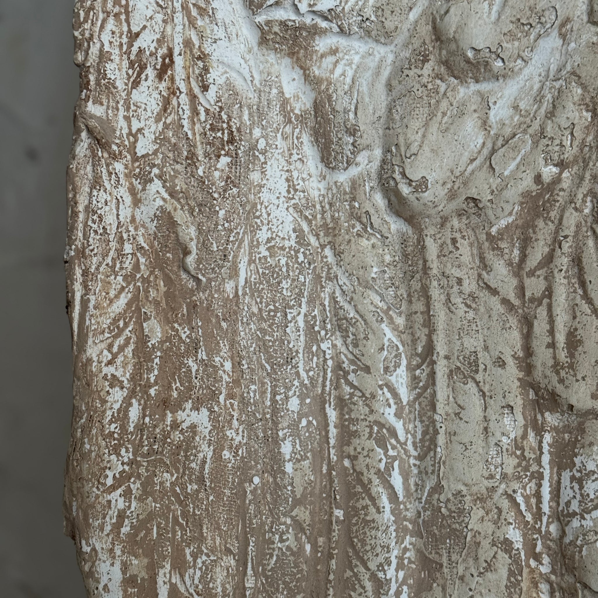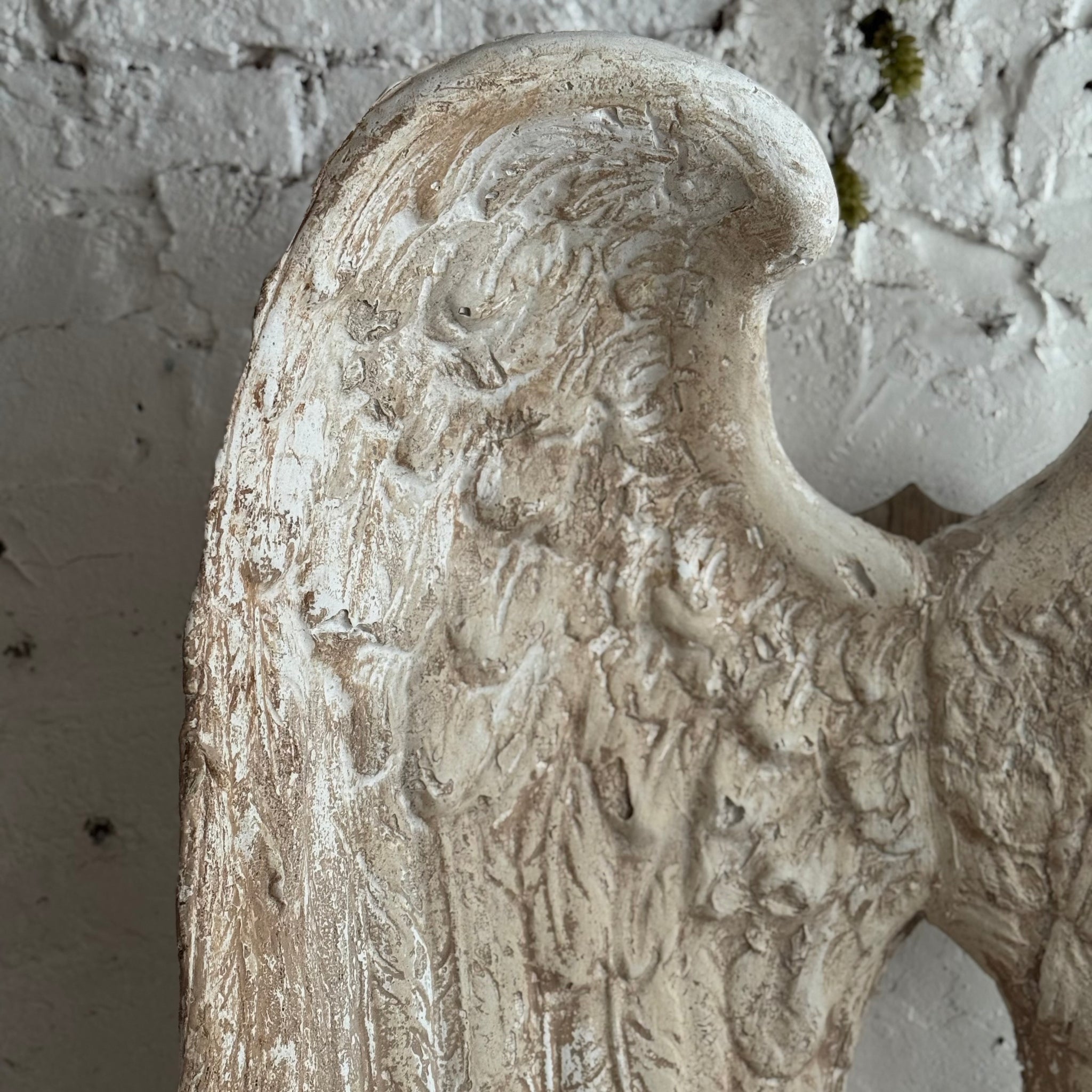 Made from plaster with a wooden shield to back that can be wall mounted.